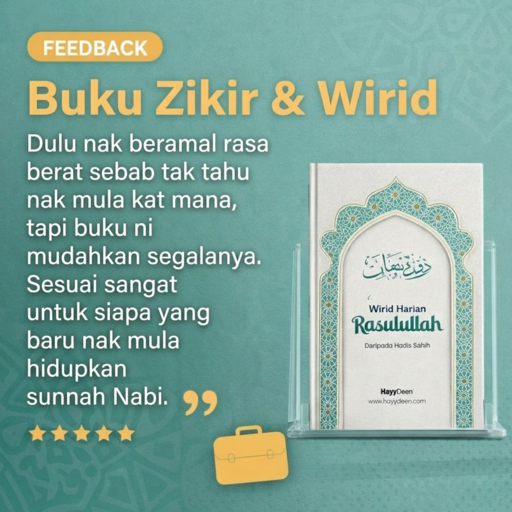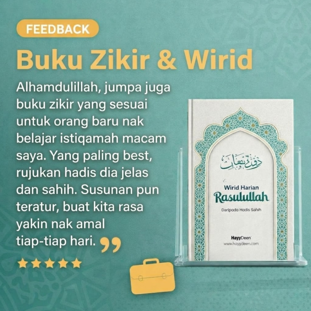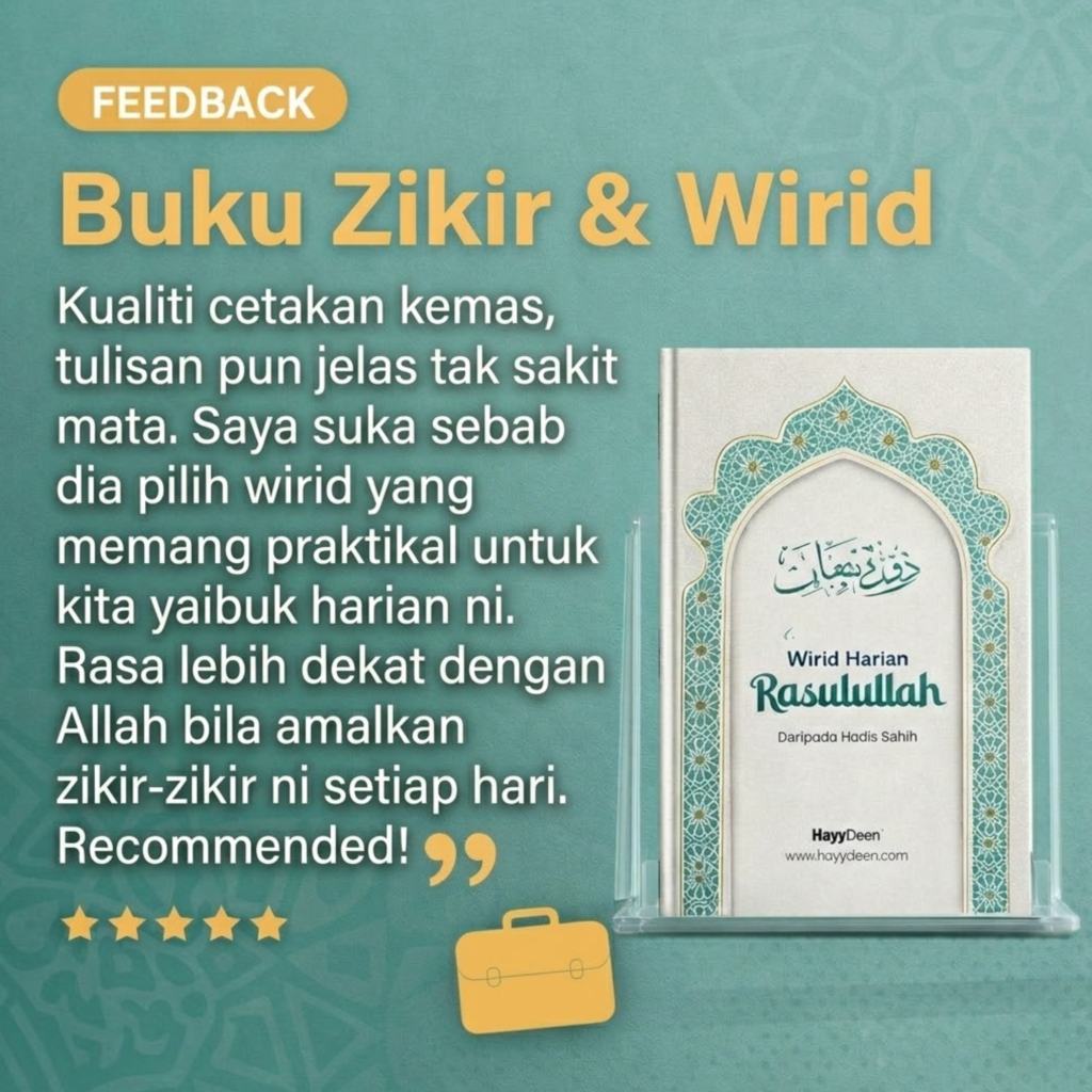 Himpunan wirid utama daripada sumber hadis sahih yang ringkas, praktikal, dan mudah diamalkan oleh semua peringkat umur.